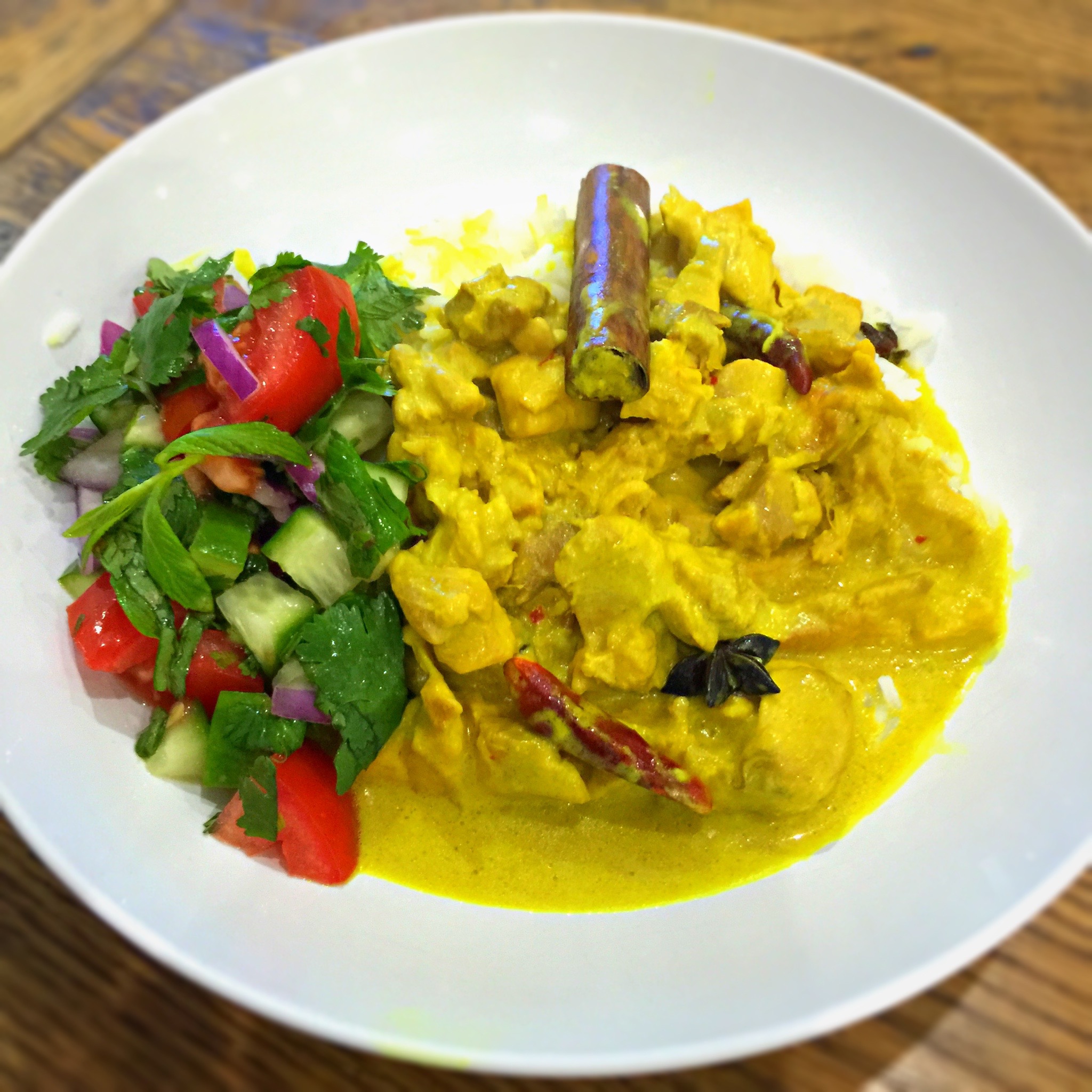 Serve with rice and salad of cucumber, coriander leaves and tomato.