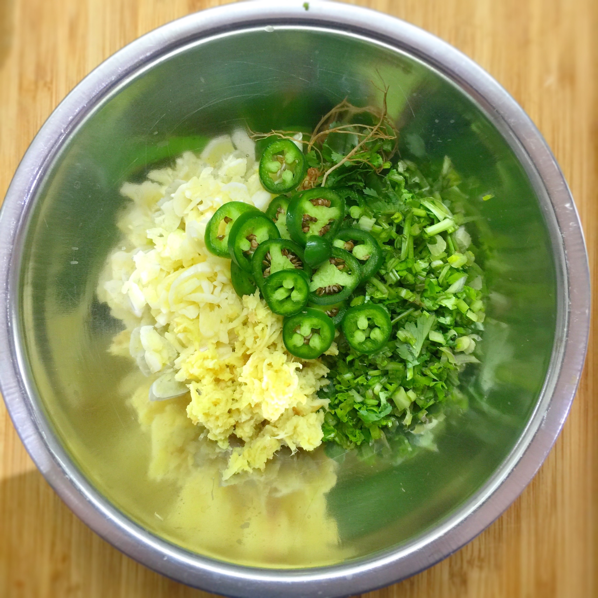 Mince garlic, grate ginger and chop coriander stems. Set aside.