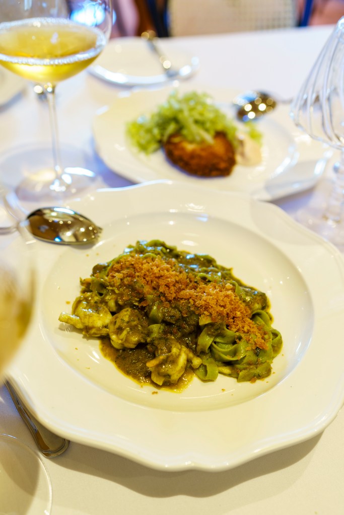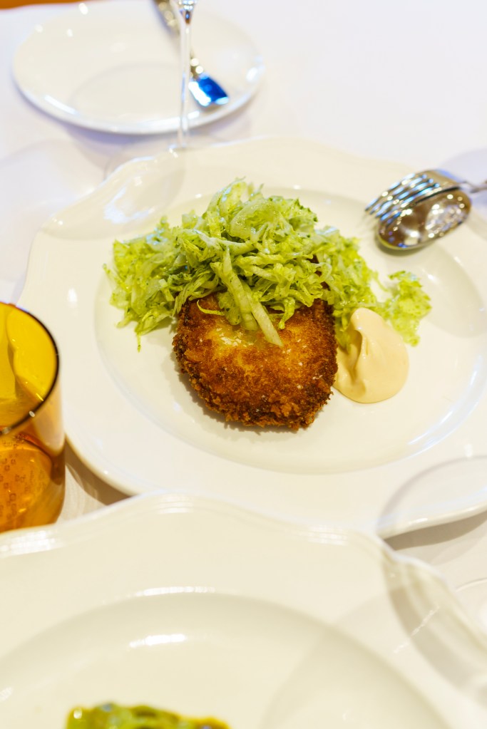 The room is rich. Sitting here feels luxurious, as if having snuck into a private club from days long gone whose members memories linger in the air, in the walls and in the menu. The menu heralds times past as food trends are ignored, its French, its decadent, yes there are carbs and butter, lots of them. The menu reads simply, similar to chef Danny Pepperell’s last restaurant 10 William street. The food, like 10 William St, is far from simple. Potato gallette, sliced thin and fried crisp, wading in a pool of creamy sauce. I picked up mine with my hands and dunked in sauce repeatedly, mopping as much sauce up as I possibly could.
