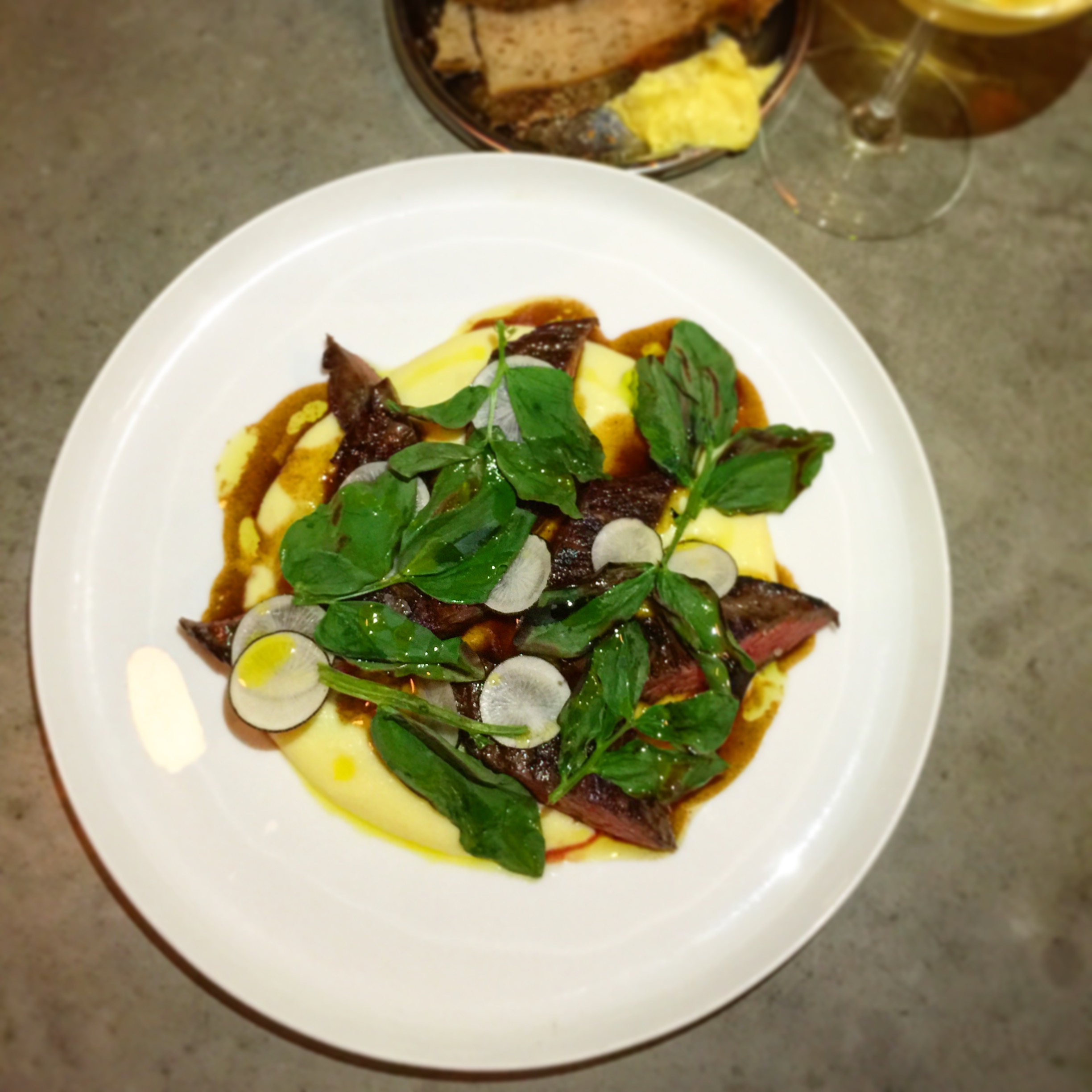 Spiced Jerusalem artichoke mash accompanies the hangar steak. I was expecting great steak flavour to reign supreme but this also melted in my mouth. Add some crisp radish and fresh basil and you have another sublime dish. The wines were also outstanding with great assistance from sommelier who brought us several wines not yet on the list. This joint is so good I wanted go back a complete the trinity by having breakfast the next day but I forced myself to try other places. http://franklinhobart.com.au/