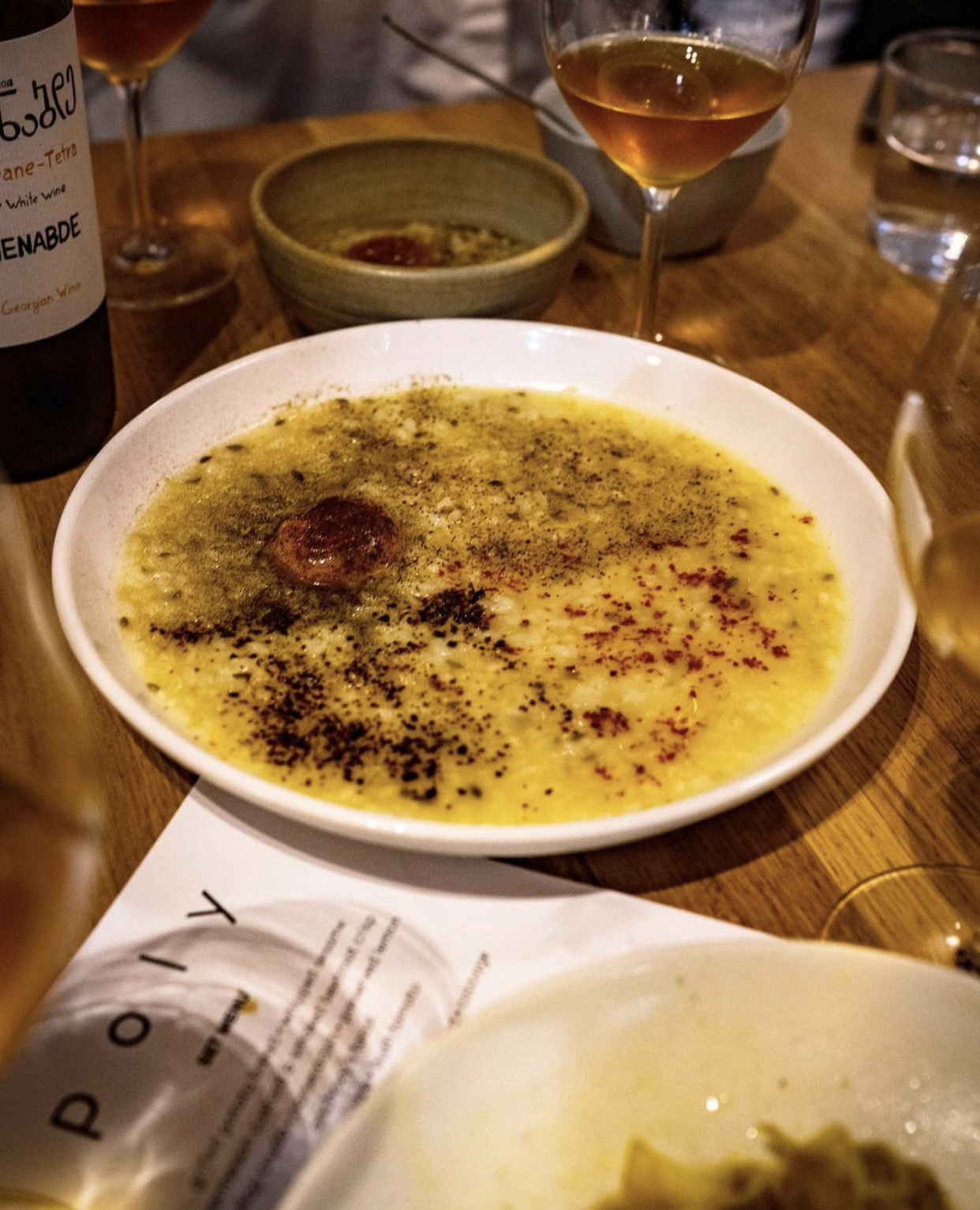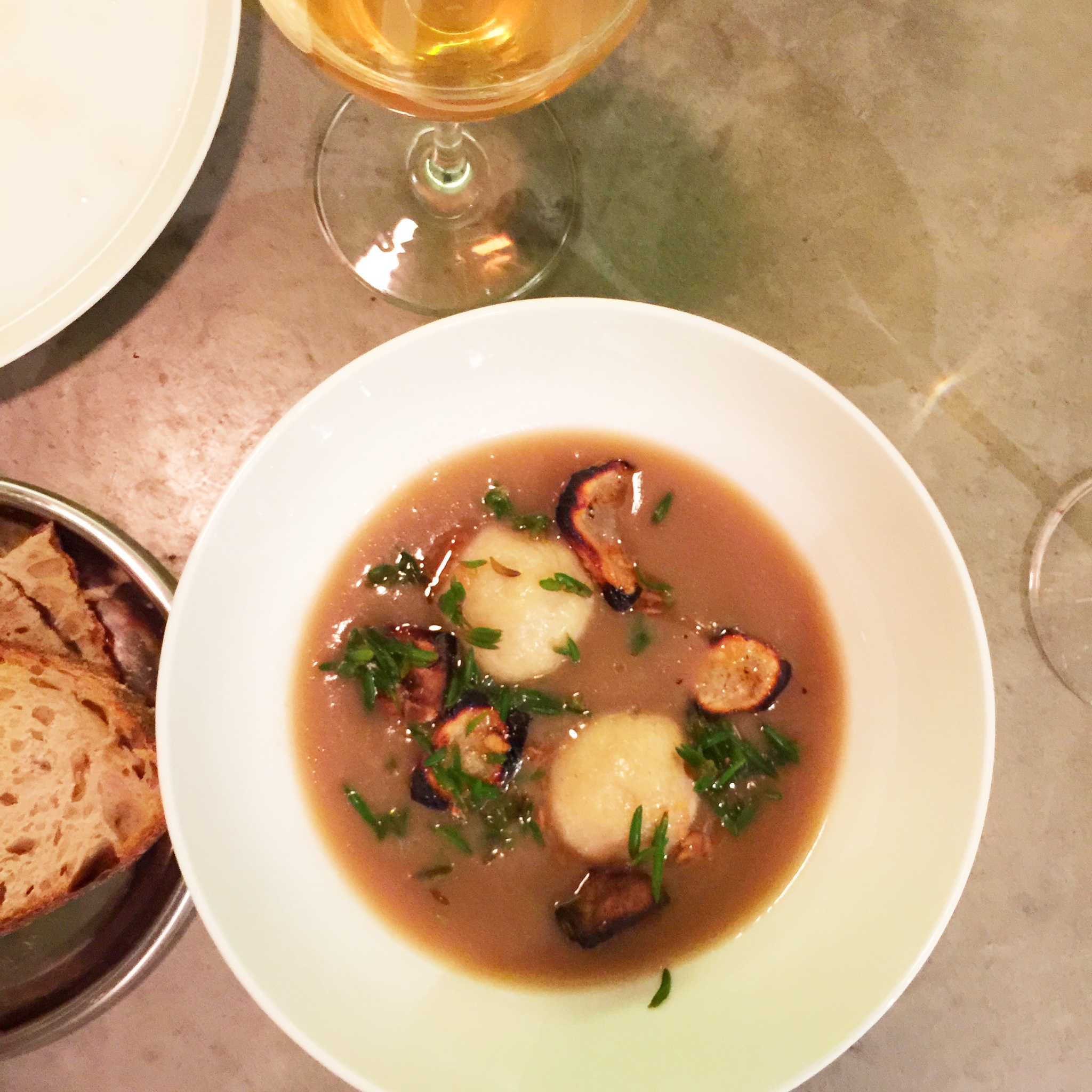 Lunch at Franklin, natural wine, chicken broth and lamb stew