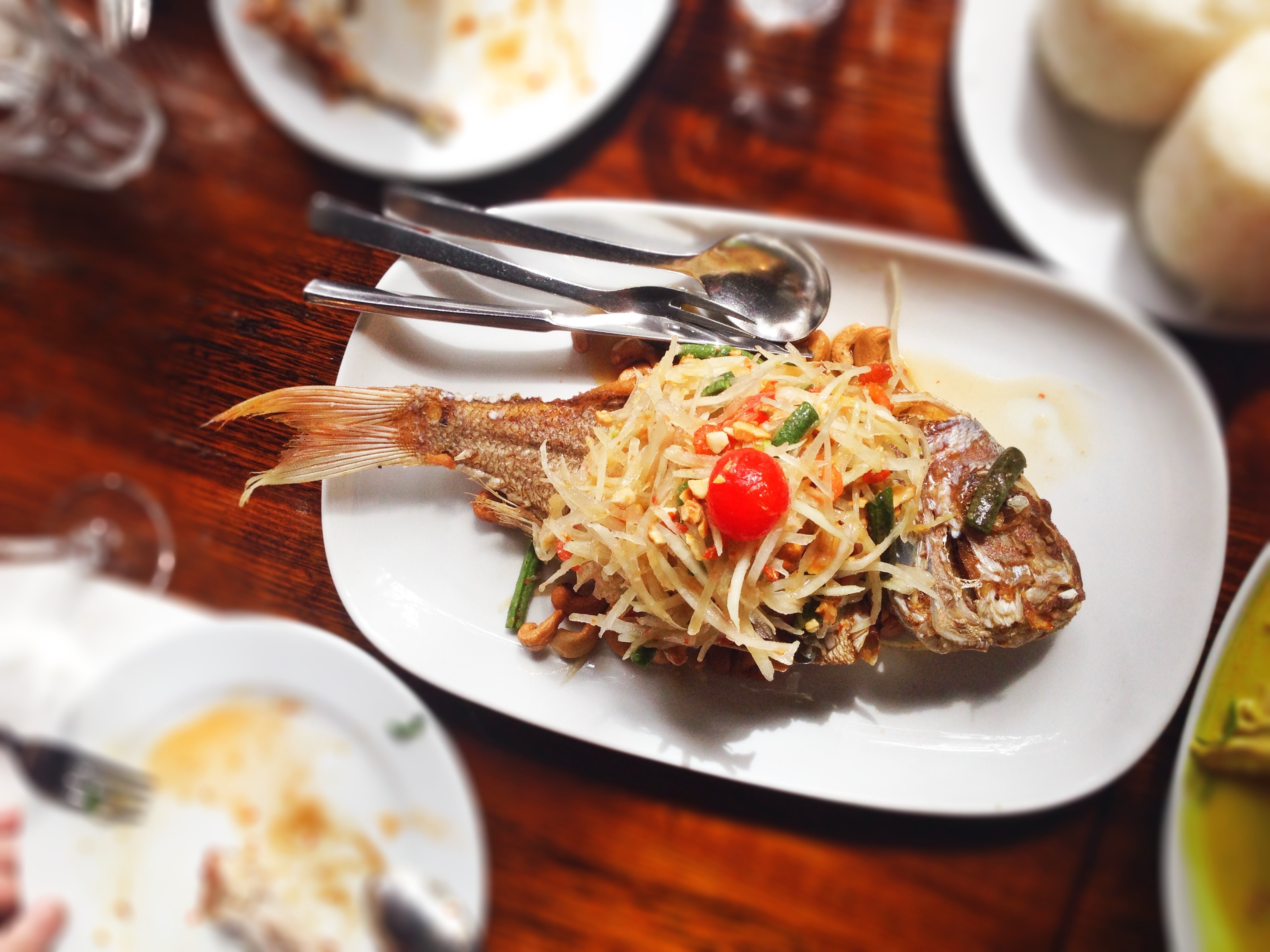 flavor. The salad looks amazing with prawns, banana leaf , nuts and herbs loving each others company as the flavor and texture is sublime. There is also several whole fish options which are great to share.
