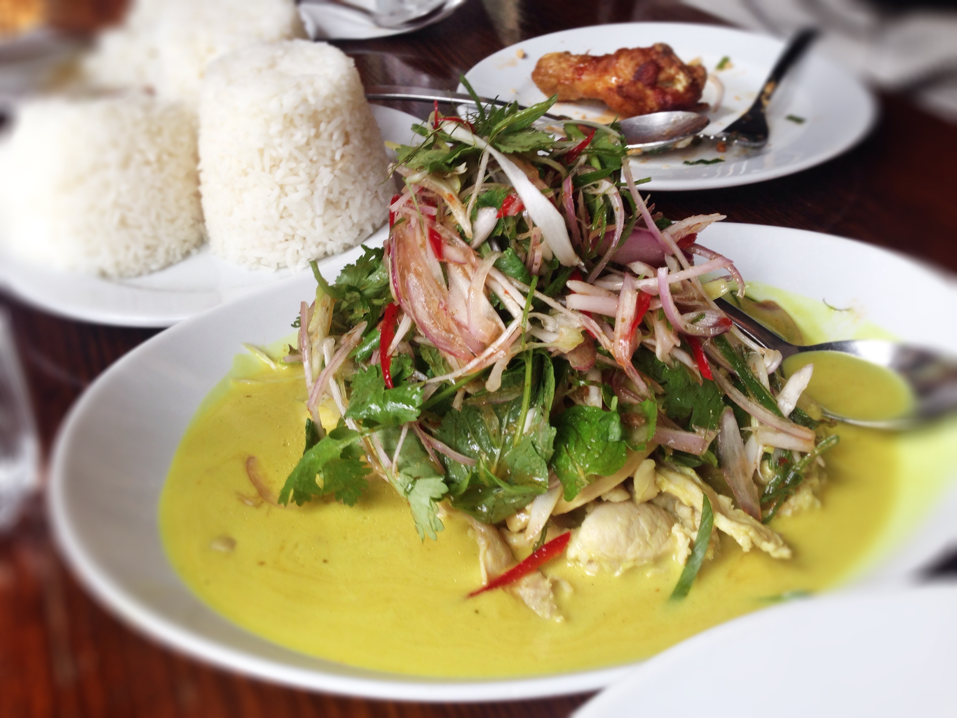 combinations. The joy of the salads here is the joining of fresh cooked protein and the fresh salad and herbs. They have a little seafood vermicelli number which has great texture added by dried prawns that are chewy and roasted peanuts for crunch and a salt hit . My daughters favourite is their Chicken and Papaya salad with coconut milk. A very generous portion of crisp fruit, tangy fresh herbs and sweet milky coconut chicken.