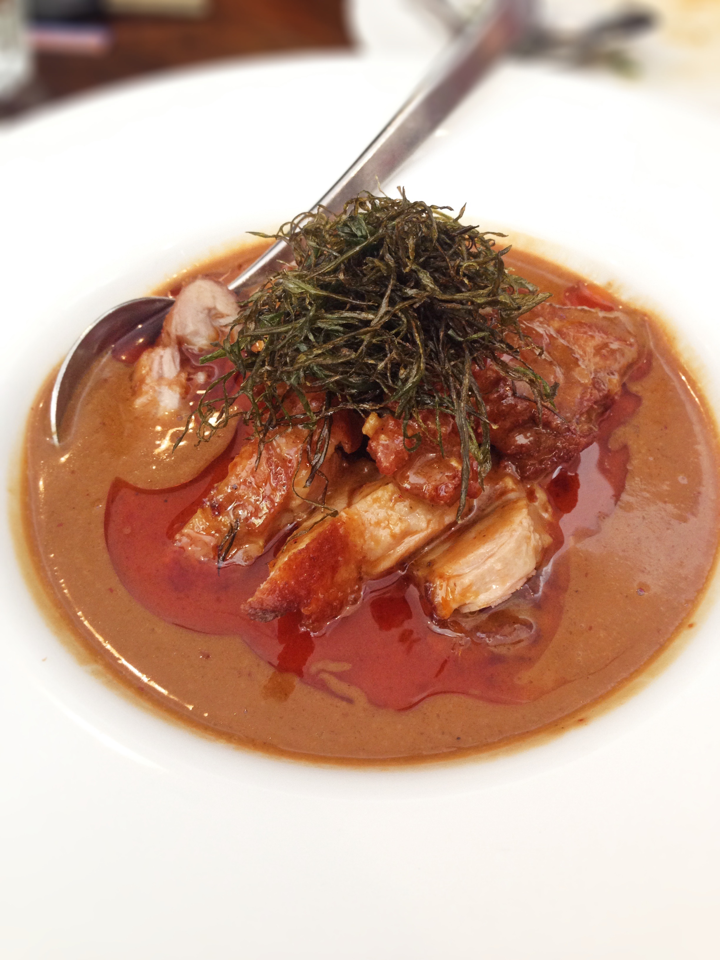 This joint has a reputation for its Chilly Pork Belly, caramelized cubes of spicy sweet crunchy chewing bites of delight, each chewy morsel in sticky sweet spicy sauce just makes you want another until, they are all gone. There are many old favourites here , like their Green Chicken Curry. This is what got me hooked to the place. The sauce is rich spicy and creamy but the major draw, for me, is the Thai vegetables and the cube of pork blood jelly. Having those veg in my curry took me staright back to the streets of Bangkok, the blood cube I’ve not seen before, or elsewhere, adds another element and brings balance to the curry sauce. This authenticity makes Spice I Am spectacular in a city filled with Thai restaurants. But don’t get stuck on the old favourites here.
