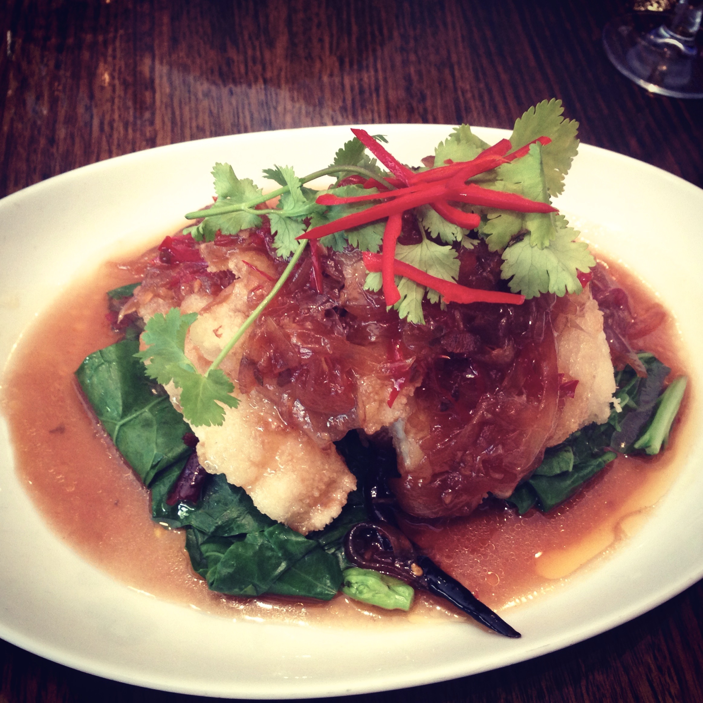 I started frequenting Spice I Am years ago when I worked in the city. They have a lunch special for $10.50. After exhausting all the specials I’d try to drag who ever I could with me so we could order more food and try more dishes. Now it’s where I meet my mum for lunch ever few weeks. One of my favourite dishes is not even on the menu, is a Tamarind Fish Fillet. The fish is deep fried in an uber light batter, the sauce and fresh herbs are added and it is served over Asian greens with sweet sticky onions.